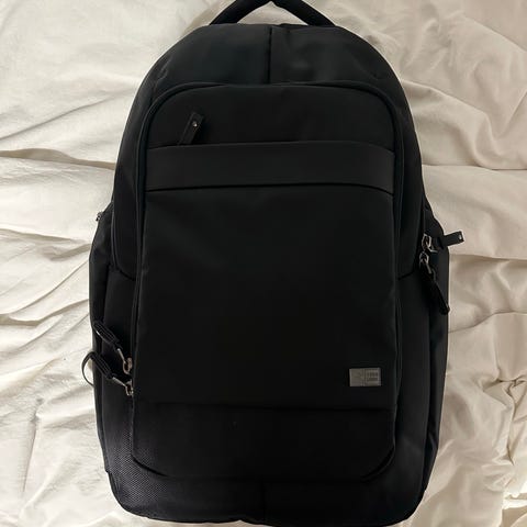 Rejäl, välvadderad med många praktiska fack. Rem för rullväska på baksidan .