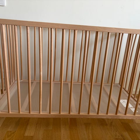 Skänker bort den här stabila spjälsängen från 90-talet. Alla skruvar finns, och sängen funkar bra! Vi har använt den fram till nyligen, men vi behöver göra plats för annat här hemma. Det finns ett visst slitage på den, då den har använts till flera barn. Det ingår ett spjälskydd, men ingen madrass.