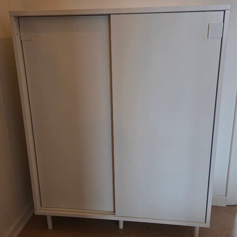 Stomme i melamin bok. Skjutdörrar, i vit melamin. Inkl hyllplan och lås.