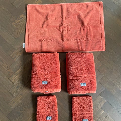 Gripsholm handduk sett i beige färg. Handduken är tillverkad i bomullsfrotté med dekorativa bårder längs kanterna. Passar för användning i badrum, vid dusch eller bad, samt som extra handduk i hemmet eller på resa + ett badlakan