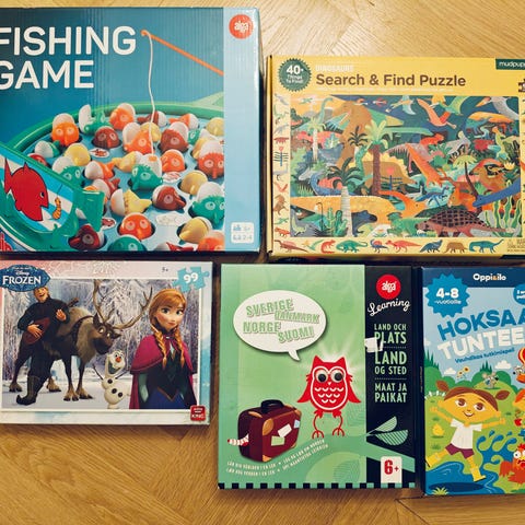 Diverse barnspel, pussel, helikopter med kontroller... Helikoptern är ny men - det finns inte tillräckligt med batteri... Nya pussel.