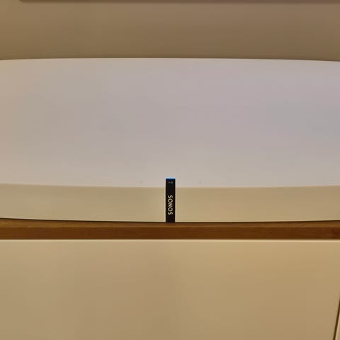 Sonos Playbase soundbar i vit färg. Soundbaren är avsedd att placeras under en TV och används för att förbättra TV‑ljud och uppspelning av musik. Enheten ansluts till TV:n och kan integreras i Sonos ekosystem för trådlös ljuduppspelning i hemmet. Lämplig för användning i vardagsrum eller andra rum där TV och ljudanläggning finns.