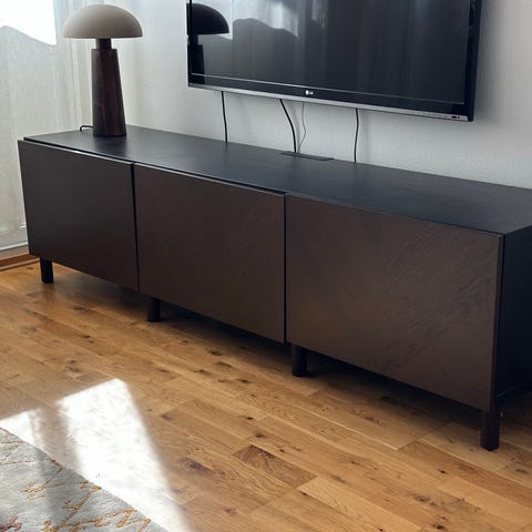 Tv-bänk med dörrar, svartbrun/Lappviken/Stubbarp svartbrun, 120x42x48 cm. Läs mer här: https://www.ikea.com/se/sv/p/besta-tv-baenk-med-doerrar-svartbrun-lappviken-stubbarp-svartbrun-s19419615/