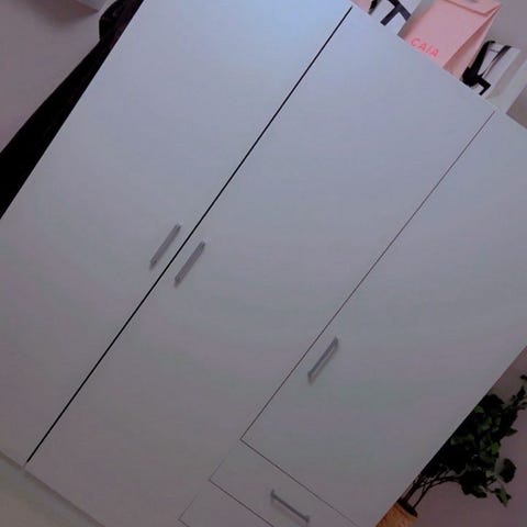 IKEA garderob i vitt utförande med tre dörrar. Garderoben har en sektion med klädstång för upphängning av kläder samt en sektion med hylla för förvaring av exempelvis lådor eller vikta plagg. Design av Aage Petersen. Passar för förvaring av kläder och textilier i sovrum eller hall.
