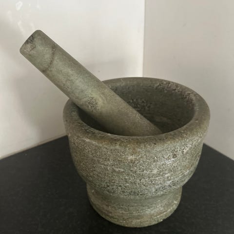 Morteln är i fint skick, stöten saknar toppen (se bilder)