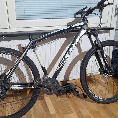 Scott mountainbike ny handtag och backbroms. Och bytta hydrauliska olja. Nya med ramstorlek L och 29" tum. Cykeln har gavel med dämpare, raka styre och hydrauliska skivbroms fram och back shimano back.Utrustad med grovmönstrade däck anpassade för terrängkörning. Passar för stigcykling, pendling och vardagsbruk på varierat underlag. 8 växlar