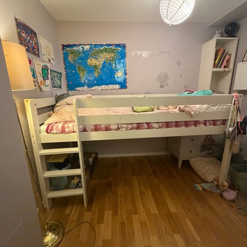 Barnsäng med madrass, förvaringsbyrå, skåp och skrivbord skänkes.