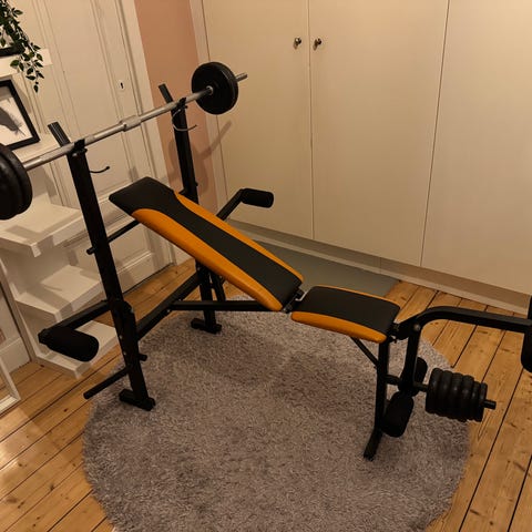 vidaXL skivstång och hantelset 30 kg. Setet består av skivstång, curlstång och två hantlar samt viktskivor som tillsammans väger 30 kg. Ej använt en enda gång!