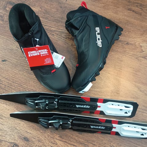 Almgrens långfärdsskridskor 42 cm inkl NY Rottefella Skatebindning NNN samt Nya Alpina Touring pjäxor i strl 38 (24 cm inv mått)