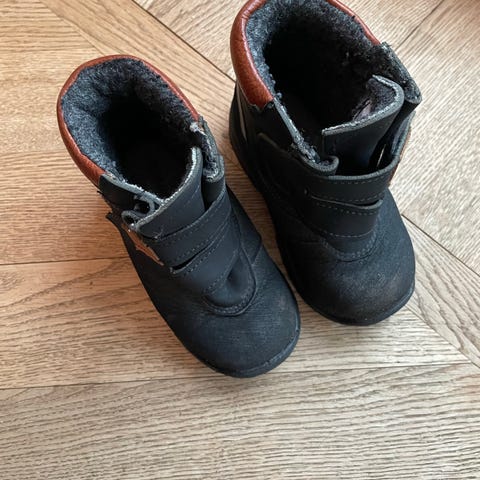 Fodrade, vattentåliga och stadiga kängor. De har greppvänliga sulor och mycket enkla att ta på med ett rejält kardborreband.