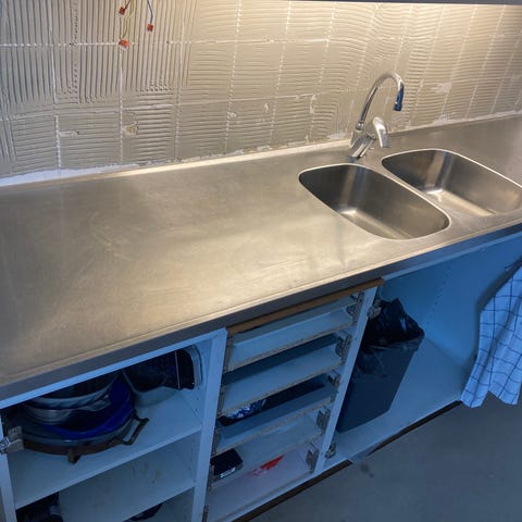 Rostfri diskbänk 220*62 säljes. Använd länge, men i helt ok skick. Uppvikt bakkant och träram på baksidan. FM Mattsson blandare med diskmaskinsavstängning samt vattenlås går att få med, båda från 2022.