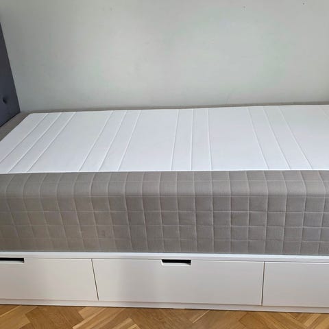 IKEA säng med förvaring i underdelen. Sängen har flera utdragslådor på ena långsidan som ger extra förvaringsutrymme. Överdelen består av madrass med bäddmadrass ovanpå. Passar som säng i sovrum eller gästrum där extra förvaring önskas. 120x200cm.