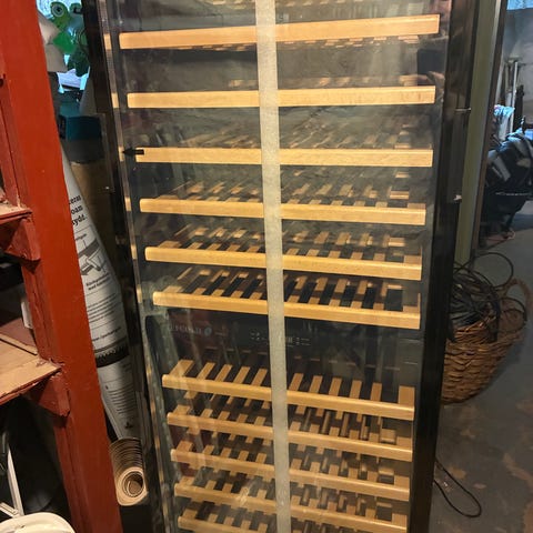 Vinkylskåpet är fristående och har en rostfri front med glasdörr och vertikalt handtag. Invändigt finns flera utdragbara trähyllor.