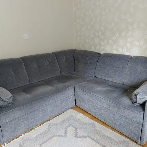 Plats för bäddmadrass under i förvaringslåda. Alla dynor går att packa ner där när man bäddar upp.