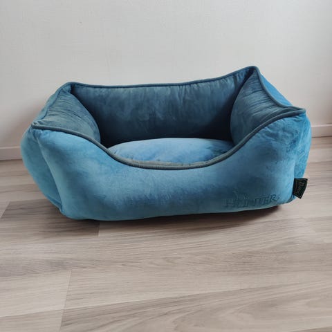 Grå oval biabädd för hund. Fräsch. Avtorkningsbar. Mått: 60x72 cm. Hämtas hos säljaren.