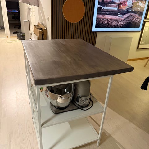 Köksö i stort sett oanvänd från IKEA med laminatskiva ”betong” i måttet 123 x168 cm 3 cm tjock, samt två golvhyllor, (se bild) och två metodskåp stommar i svart lasyr innehåller tre lådor för två lådfronter. (Fronter, lampa och vägghylla ingår ej.) 60x60x80 cm på skåpen.