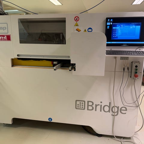 Arbetsbord i metall med integrerade måttskalor och justerbara anhåll för noggrann inställning. På bilderna syns flera borrhuvuden och tillhörande hylsor. Fotpedal för styrning samt reglage på frontpanelen. Lämplig för snickeri- och möbelproduktion där återkommande hålborrning krävs.