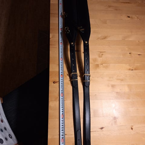 Remmarna har vadderade axelpartier och justerbara spännen i metall för att kunna anpassas i längd. Tillverkade i syntetmaterial/läder