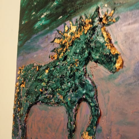 Tavla i form av en oljemålning med havsmotiv. Målningen föreställer strandgräs i förgrunden, hav och horisont i bakgrunden samt fåglar i luften. Färgskalan går i blå, gröna och beige toner. Tavlan är inramad i en enkel träram.