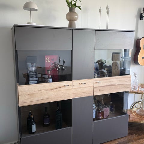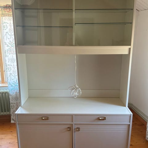 Vitrinskåp i vitmålat trä. Överdel med två vitrindörrar med glas och spröjs samt öppna hyllplan i mitten. Underdel med skåpsförvaring och låda, lådor har grön klädd insida. Dekorativa profiler och paneldörrar framtill. Passar som förvarings- och displaymöbel i kök, matsal eller vardagsrum.