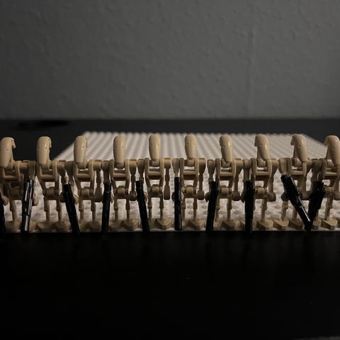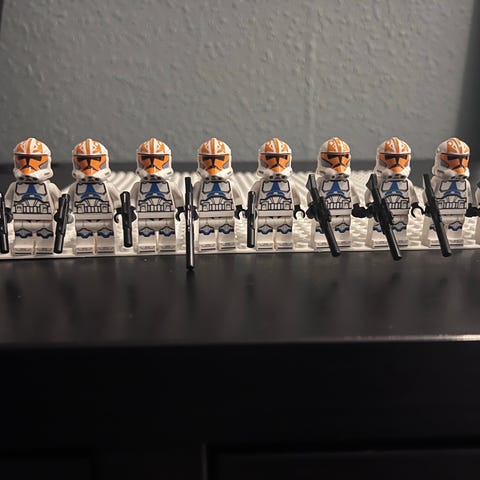 LEGO Star Wars minifigurer. Flera olika klon- och soldatfigurer visas på bilderna, placerade på en vit basplatta. Figurerna har varierande rustningar, färger och hjälmar samt är utrustade med olika typer av vapen. Passar som komplettering till LEGO Star Wars-samlingar eller för lek och display tillsammans med andra LEGO-set i samma tema.