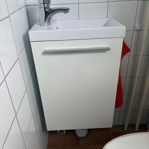 Ikea tvättställsskåp med tvättställ, bredd cirka 60 cm. Skåpet är vitt med två lådor och är avsett för montering på vägg i badrum. Tvättstället har ett standardplacerat hål för blandare och avlopp. Måtten enligt bild: bredd ca 64 cm inklusive tvättställ, djup ca 43 cm och höjd ca 65 cm. Levereras med skåpstomme, lådfronter och tvättställ enligt bilder.