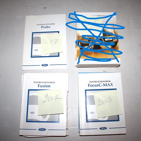 OANVÄNDA INSTRUKTIONS BÖCKER finns följande FORD modeller och säljes 175 kr/st. Escort 1981, Escort 1992,Sierra 1992, Scorpio 1992,Taunus 1973