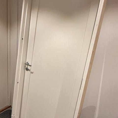 Swedoor innerdörr i vit färg. Dörren är avsedd som innerdörr och har en bredd på cirka 70 cm enligt måttbandet på bilden. Utrustad med beslag för gångjärn och handtag/lås. Passar för användning inomhus i bostad eller liknande miljö där en slät, vit innerdörr önskas.