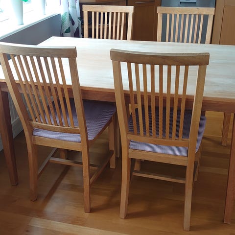 Skivan har vi gjort om och lagt överblivna kakel och klinker plattor på efter diverse renoveringar. Bordet är väl använt och har agerat matbord, pysselbord, bordbord så det finns en del förslitningar därav skänker vi det. Plats för 4 stolar(medföljer EJ), det finns även en iläggsskiva, den är dock i trä.