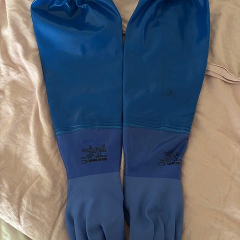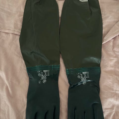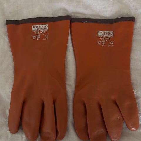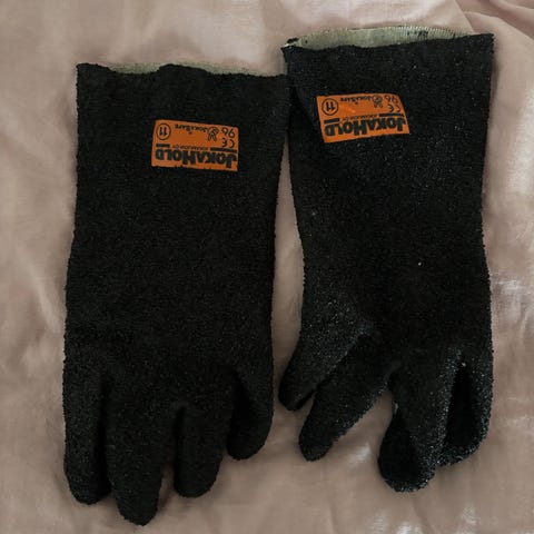 Ett par gula och svarta arbetshandskar / skyddshandskar från JokaPolar. Vattentät handske med supergrepp. För fiskare, hantverkare, virkeshantering m.m.