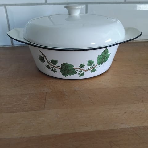 Ny Oanvända jättefina Emalerad Gryta med lock och elegant dekorativt motiv av blommor på en krämig vit bakgrund , lätt att rengora, drygt 1.5 liter