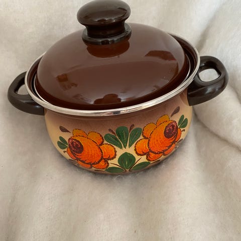 Ny Oanv EMAL ERAD GRYTA med lock o motiv av blommor