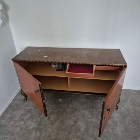 Sideboard i mörkt trä med dekorativa sniderier. Möbeln har en övre del med lådor och en nedre del med skåpsförvaring bakom dörrar. Tidigt 1900-tal. Sakerna på hyllan ingår förstås inte.