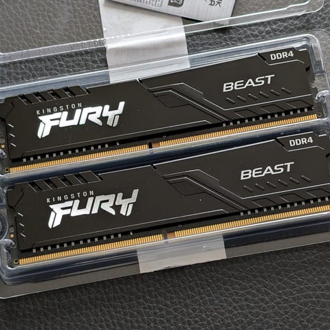 HyperX Fury 16 GB (2x8 GB) DDR4 RAM-minne. Funkar precis som de ska och har kört bl.a. GTA V och RDR 2 utan några problem.