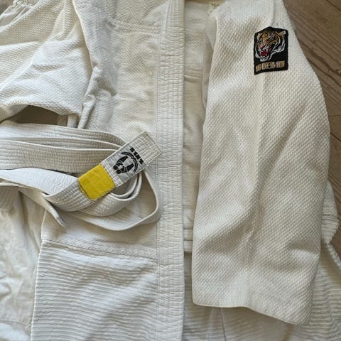 Judodräkt storlek 140 med halvgult bälte. Jag har själv sytt på ett gult tygband för att bältet ska bli halvgult.