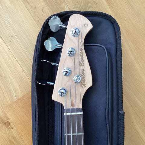Jackson elbas i vit färg med fyra strängar. Basen har två Jackson-mikrofoner av P-typ och J-typ med separata rattar för volym och ton. Hals i ljust trä med markerade band och svart huvud. Baksidan har skruvad halsinfästning och elektroniklucka. Medföljer vadderad svart gigbag för förvaring och transport.