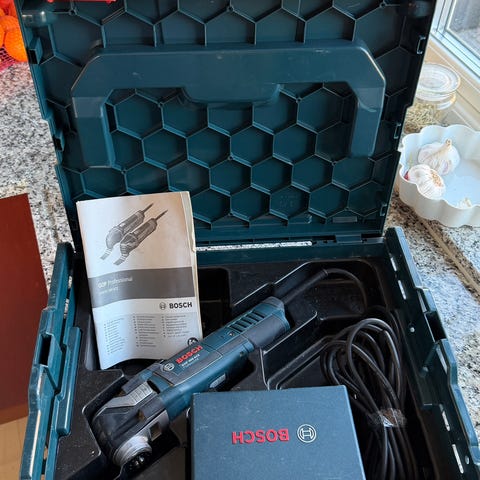 Bosch GST 90 E Professional sticksåg. Sticksågen levereras i en Bosch-märkt förvaringslåda. Medföljer gör även en insexnyckel, ett dammutsugsadapter och ett urval av sågblad.