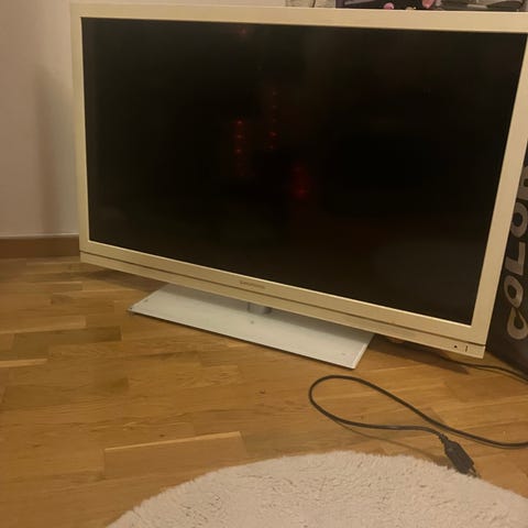 LG tv i vit färg. Platt skärm som står på rund fot. Passar för placering på bänk eller bord i vardagsrum, sovrum eller liknande utrymme. Tvn är 32 tum.