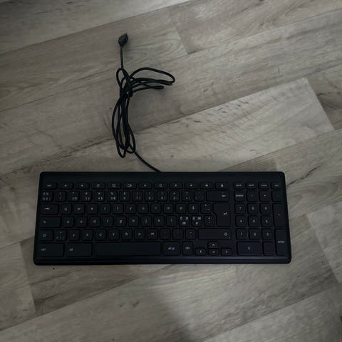 HP tangentbord med kabel i svart och silver. Standardlayout med numerisk del och funktionsknappar. Ansluts via kabel (troligen USB, se kontakt på bild) för användning med stationär eller bärbar dator. Passar för allmän kontorsanvändning, studier och vardagligt bruk där ett fullstort tangentbord önskas.