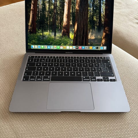 MacBook Air med Apple M1-krets och 8 GB minne. Operativsystem macOS Tahoe 26.3.