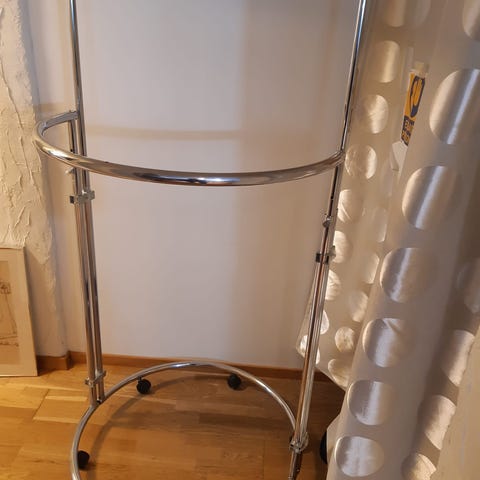 Ställningen har överliggare i metall för upphängning av kläder och nederhylla i galler för extra förvaring.