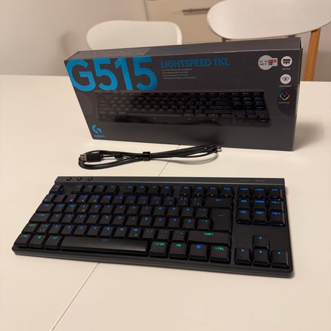 Logitech G915 TKL tangentbord med trådlös anslutning och RGB-belysning. Tenkeyless-layout utan numerisk del, vit färg. Anpassningsbar bakgrundsbelysning och dedikerade mediatangenter. Passar för användning med dator för spel och arbete där ett kompakt mekaniskt tangentbord önskas.