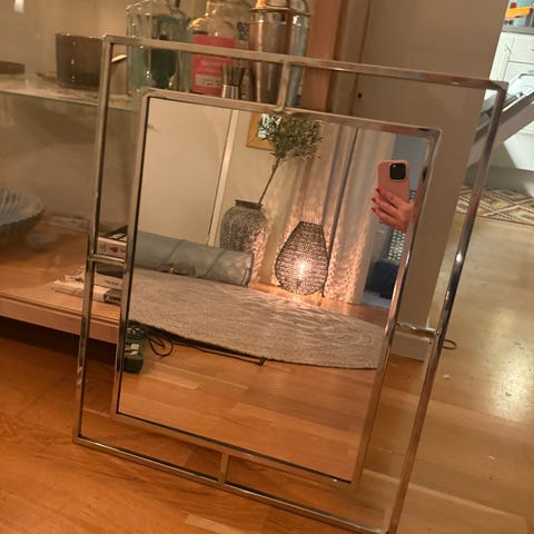 Mio spegel med ram i trä. Spegeln är rektangulär och har upphängningsanordning på baksidan. Färgen på ramen är ljus med en något sliten finish.