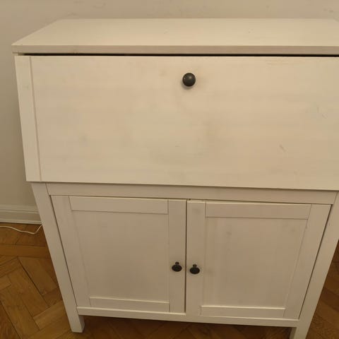 Jag har målat och lackat skåpet samt tapetserat från svensk tenn. Dock upplever jag att den grå färgen från jula är lite skör dvs det vita under syns kan komma mer vid flytt av skåpet skickar med resterna av färgen. Denna sekretär från hemnes har utgått från sortimentet. Den är inte helt målad grått utan invändigt bakom skåpluckorna är kvar original vit.