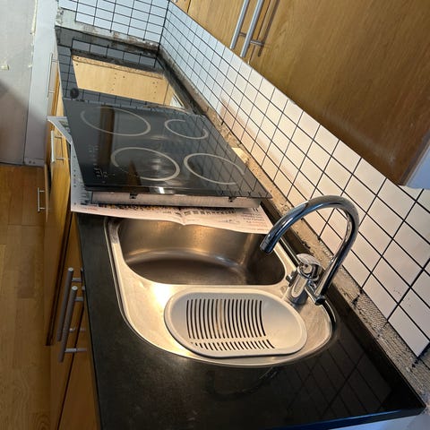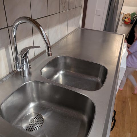 Diskho med dubbel ho och avrinningsyta, inklusive köksblandare. Monterad i bänkskiva med träutseende/laminat. Passar för installation i kök där man önskar komplett lösning med ho, blandare och arbetsyta runtom. Exakta mått och fabrikat är inte angivna.