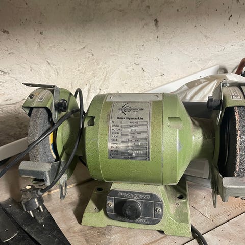 Bänkslipmaskin med dubbla slipskivor för slipning och skärpning av verktyg och mindre metalldelar. Utrustad med skyddsskärmar och gnistskydd ovanför slipskivorna. Maskinen har stabil fot för placering på arbetsbänk och strömbrytare på framsidan. Passar för användning i hobbyverkstad eller garage för enklare sliparbeten.