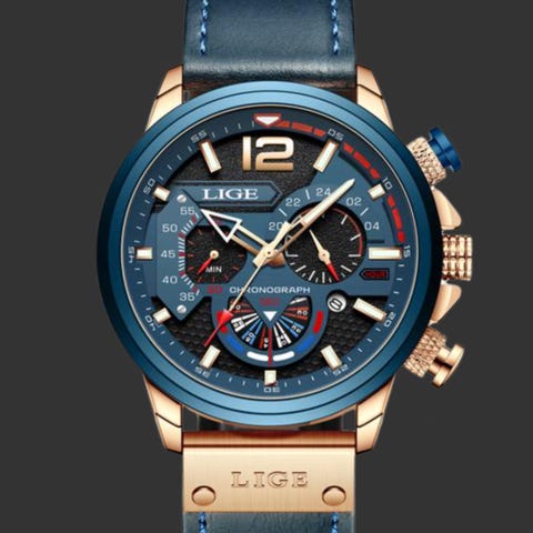 LIGE armbandsur kronograf svart guld läder herr