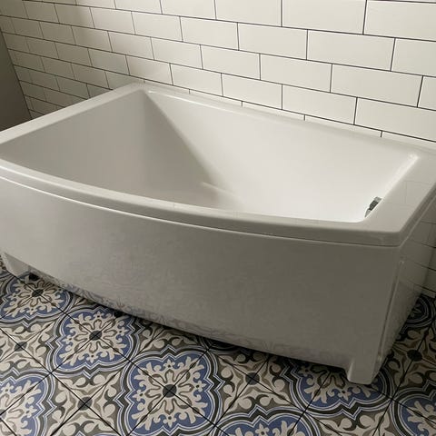 Rektangulärt badkar i vit färg. Fristående mot vägg med frontpanel och badkarsblandare monterad på väggen. Passar för installation i badrum med kaklade väggar. Lämpligt för normalstor badrumsplanering där ett standardbadkar önskas.