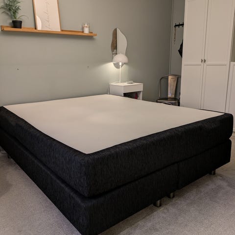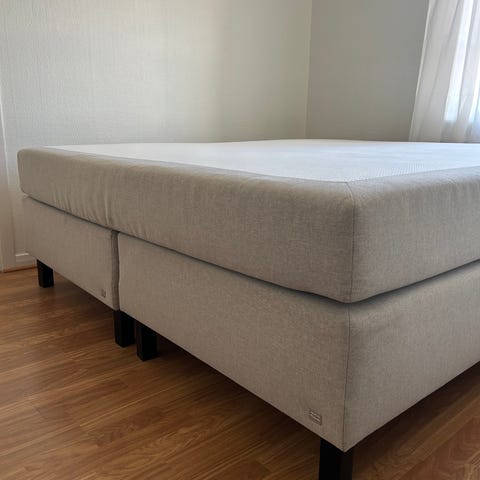 IKEA säng med madrass i grått tyg. Sängen består av en vadderad sängram med textilklädsel och en vit madrass ovanpå. Passar som dubbelsäng i sovrum eller gästrum.