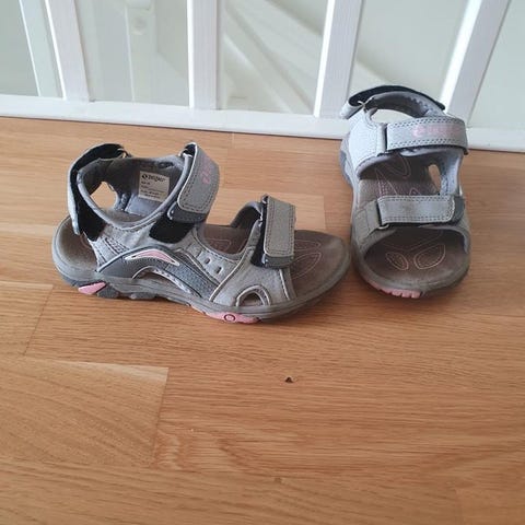 Vita sandaler för flicka i storlek 20. Min mättning av innermått är 128 mm. Knäpps med kardborre och på det sättet bredden kan justeras efter fötterna. Sandaler är i normal begagnad skick.